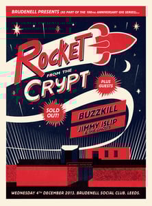 Silkscreen poster designed and printed to commemorate Rocket From The Crypt's December 2013 appearance at the Brudenell Social Club, Leeds (UK).